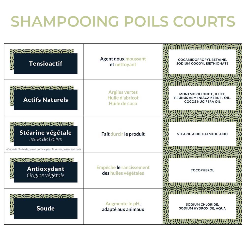 • Le shampooing poils courts est formulé à base d’huile d’abricot et d’huile de coco bio pour offrir naturellement au poil un effet satinant.