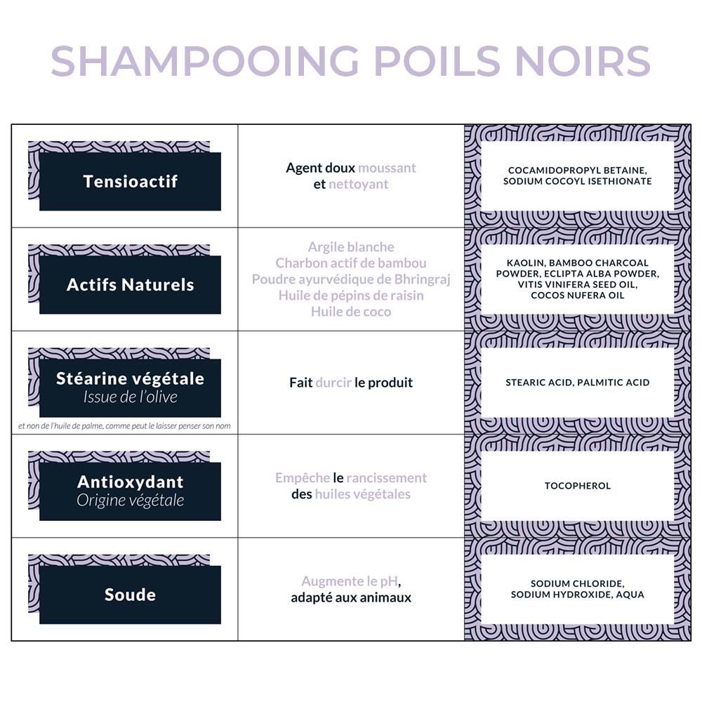 • Le shampooing poils noirs associe les bienfaits nourrissants de l’huile de pépins de raisin et de l’huile de coco bio, aux propriétés fortifiantes de la poudre ayurvédique de Bhringraj. Cette poudre indienne permet de diminuer la chute des poils.