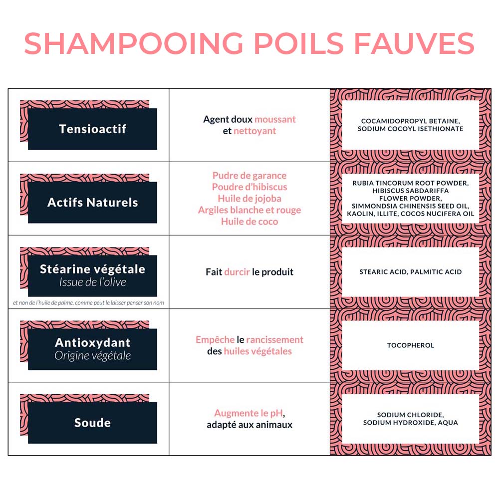 Le shampooing poils fauves contient de l’huile de jojoba qui donne de la vitalité au poil, sans le rendre gras. Elle est accompagnée d’une huile de coco, pour son action lissante et nourrissante.